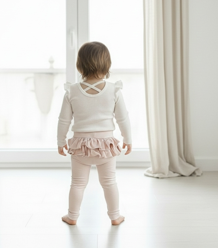 Pehmoisesta sekä joustavasta ribbitrikoosta valmistuvat frillaleggarit. Frillat kiertävät läpi pepun mutta loppuvat housun sivuille. Valitse koko lapsen pituuden mukaan. Mikäli lapsi on muodokkaampi suosittelemme valitsemaan kokoa isomman. Vyötäröllä super pehmoinen joustokuminauha.
