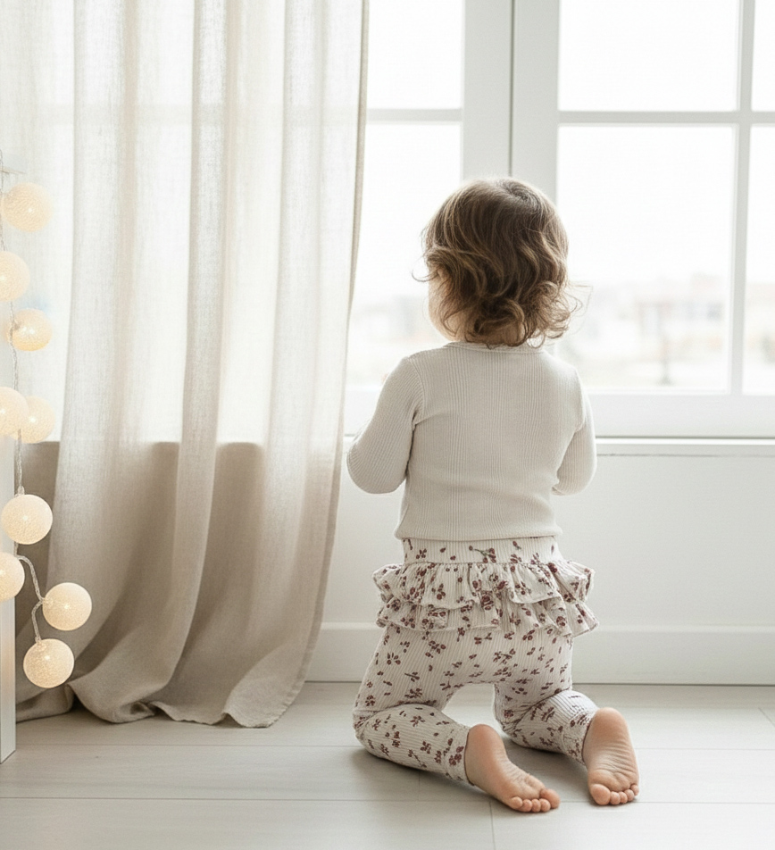 Pehmoisesta sekä joustavasta ribbitrikoosta valmistuvat frillaleggarit. Frillat kiertävät läpi pepun mutta loppuvat housun sivuille. Valitse koko lapsen pituuden mukaan. Mikäli lapsi on muodokkaampi suosittelemme valitsemaan kokoa isomman. Vyötäröllä super pehmoinen joustokuminauha.