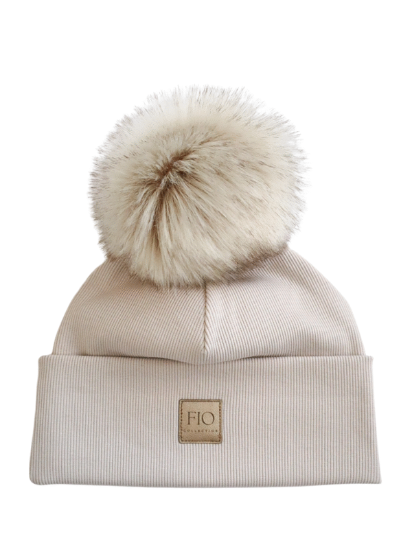 Kaksinkertaisesta ribistä valmistettu ribbipipo. Taitteen kohdala ribbiä on neljä kerrosta. Tupsu on tekoturkiksesta valmistettu. kiinnitetää pipon sisäpuolelle rusetilla joten halutessaan tupsun saa itse irroitettua ja kiinnitettyä uudelleen.